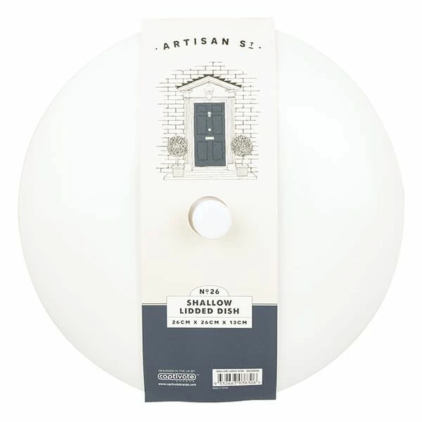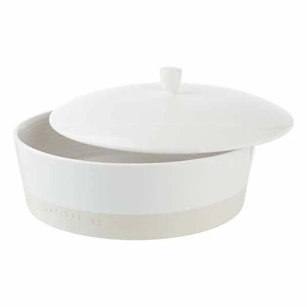 The shallow lidded dish is part of the Artisan Street collection and features the brand logo as part of the design.