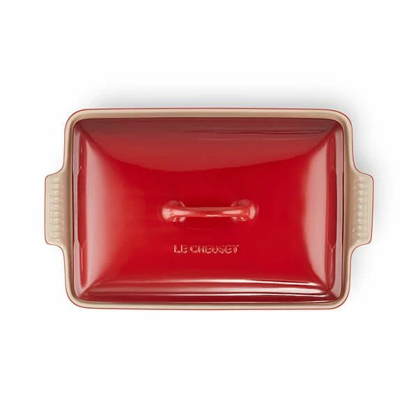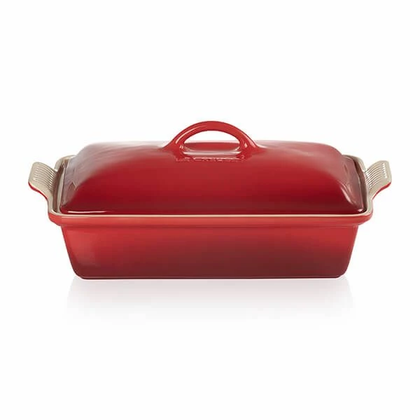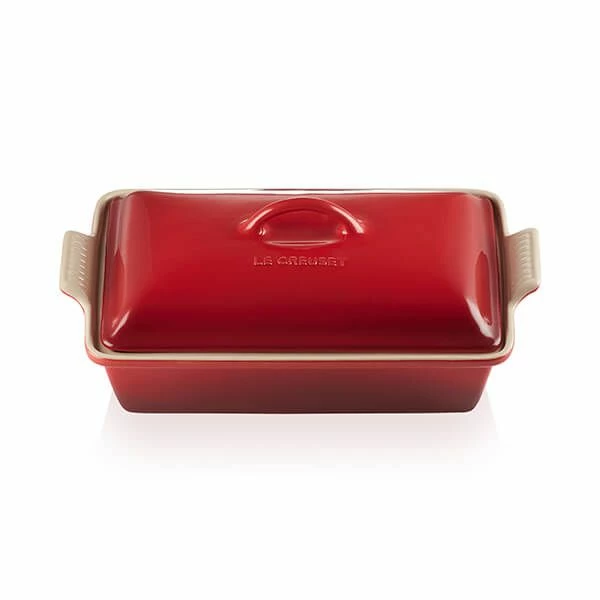 This Le Creuset Cerise Heritage Rectangular Stoneware Dish with matching lid is part of the Heritage inspired by classical french designs.