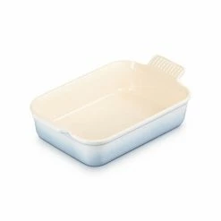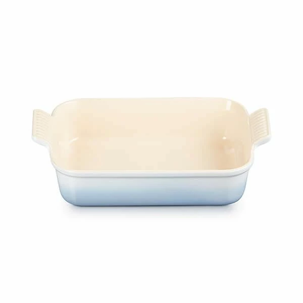 This Le Creuset Stoneware Heritage Rectangular Dish, finished in Coastal Blue, is durable and designed with easy-grip scalloped handles.