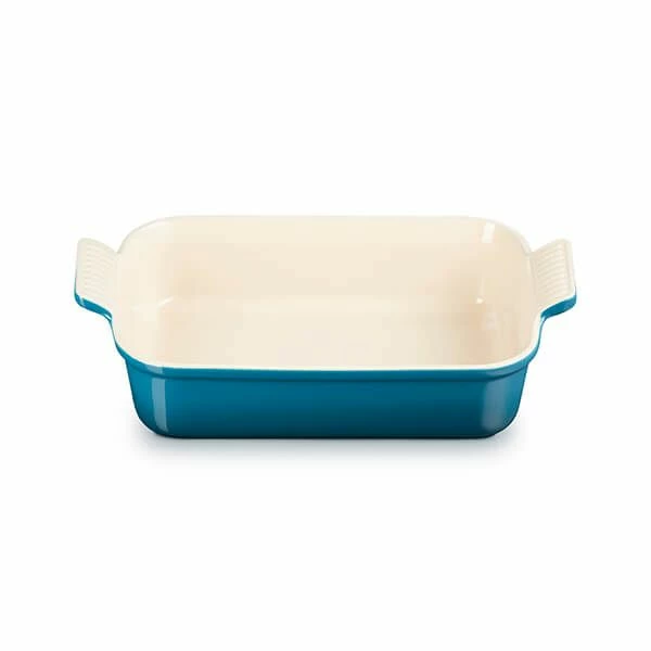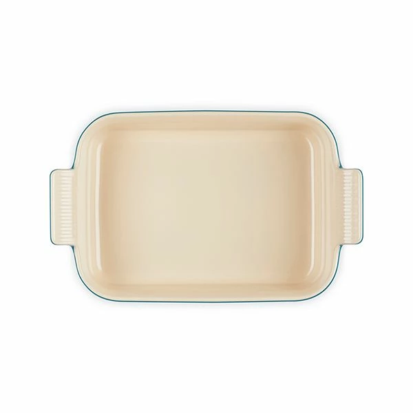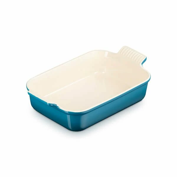 This Le Creuset Stoneware Heritage Rectangular Dish, finished in Deep Teal, is durable and designed with easy-grip scalloped handles.