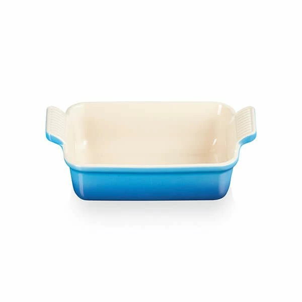 This Le Creuset Stoneware Heritage Rectangular Dish, finished in Marseille, is durable and designed with easy-grip scalloped handles.