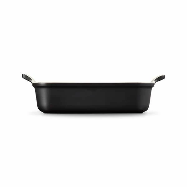 This Le Creuset Stoneware Heritage Rectangular Dish, finished in Matte Black, is durable and designed with easy-grip scalloped handles.