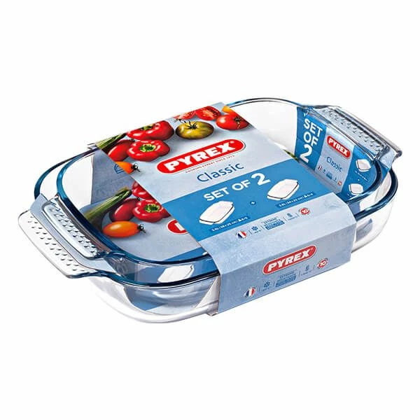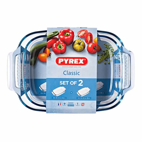 This 2 piece Pyrex heat resistant glass roaster set is perfect for all of your cooking needs, both savoury and sweet. Easy to clean, hard wearing and durable, whilst being safe and hygienic to use too. Dimensions of each roaster: 38cm x 25cm and 34cm x 22cm.