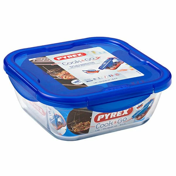 This medium square Pyrex Cook & Go dish is made from shock resistant borosilicate glass and includes a plastic lid that closes securely for an airtight and leak proof seal.
