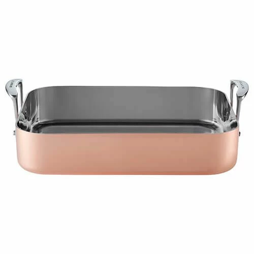 This copper roasting pan measures 35cm x 24cm has a 5.5L capacity.